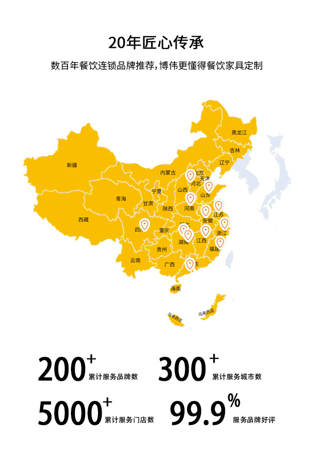 博偉餐飲家具專業(yè)服務(wù)餐飲家具20余年,先后服務(wù)1000+連鎖餐飲,業(yè)務(wù)覆蓋10多個省份300+城市,用好原料做好桌椅,全國質(zhì)保,注重品質(zhì)服務(wù)。